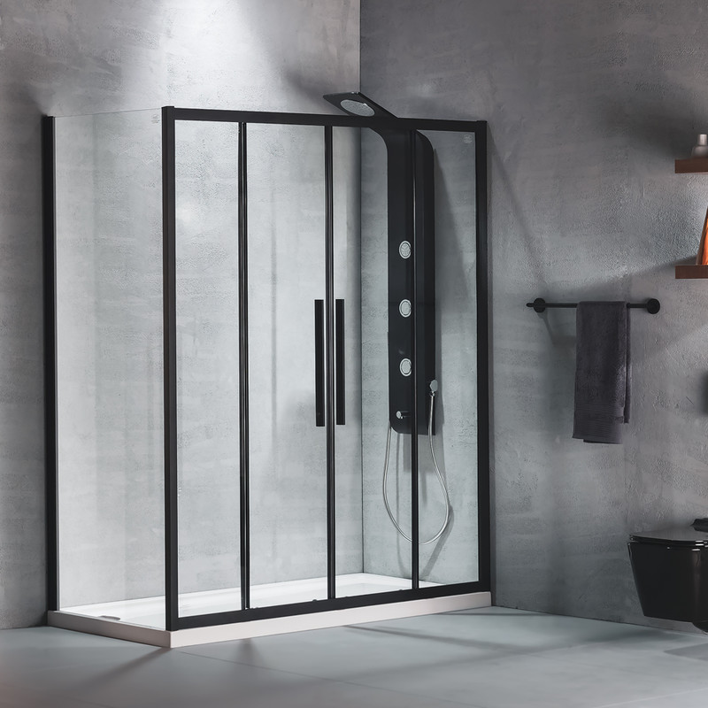 Συρόμενες πόρτες καμπίνας ντουζιέρας Flow Slider 2+2 Devon Clean Glass Black Matt ύψους 195εκ. με δύο συρόμενα και δύο σταθερά φύλλα.
