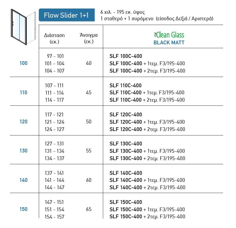 Συρόμενη πόρτα καμπίνας ντουζιέρας Flow Slider 1+1 Devon Clean Glass Chrome ύψους 220εκ. με ένα συρόμενο και ένα σταθερό φύλλο.